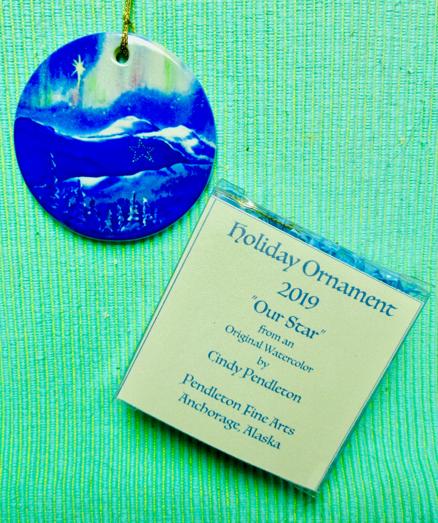 This year's design celebrates our iconic Star on the Mountain here in Anchorage, Alaska. This much loved holiday star shines down from our Chugach Foothills, a beacon of light from the thanksgiving weekend until the last Iditarod musher arrives in Nome in March. Originally created by our military in the early 50s, it lights up our cold, dark winters, and warms our hearts.