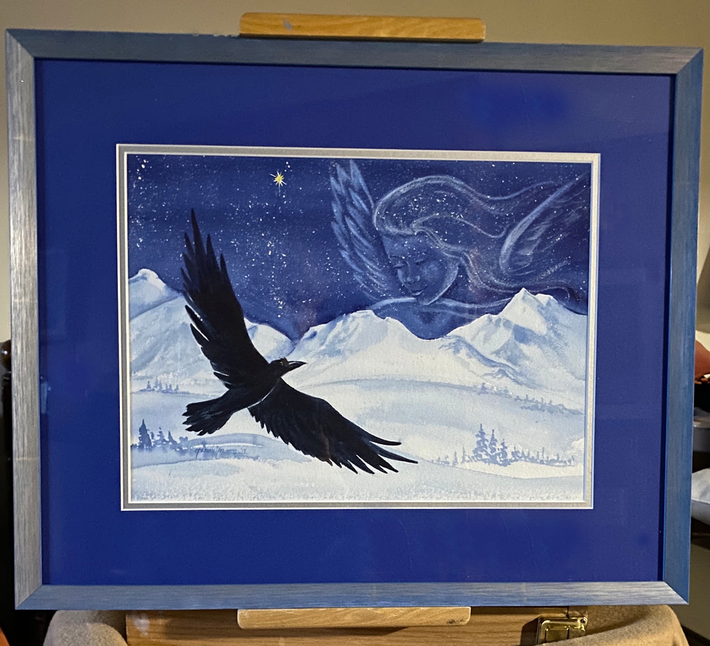 This watercolor was inspired by an old French legend that tells us that the raven was the first to hear the news of the birth of the Christ child. Raven was flying one night over the fields of Bethlehem when suddenly the sky was filled with angels. They told him the great tidings, and Raven flew off at once to spread the joyous news that the baby who would open the doors to heaven had arrived that starry night.